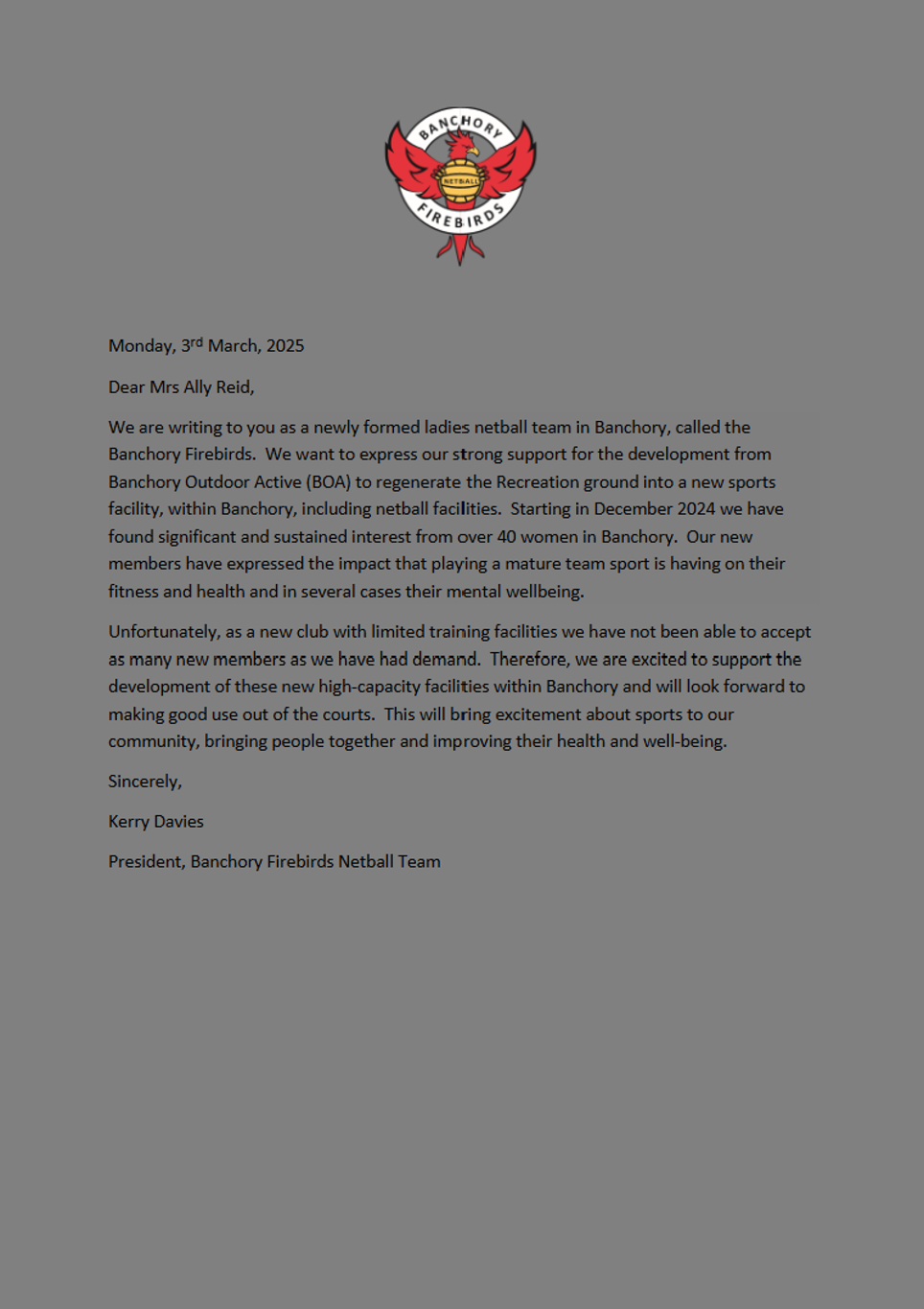 Selected letters of support from local clubs and organisations