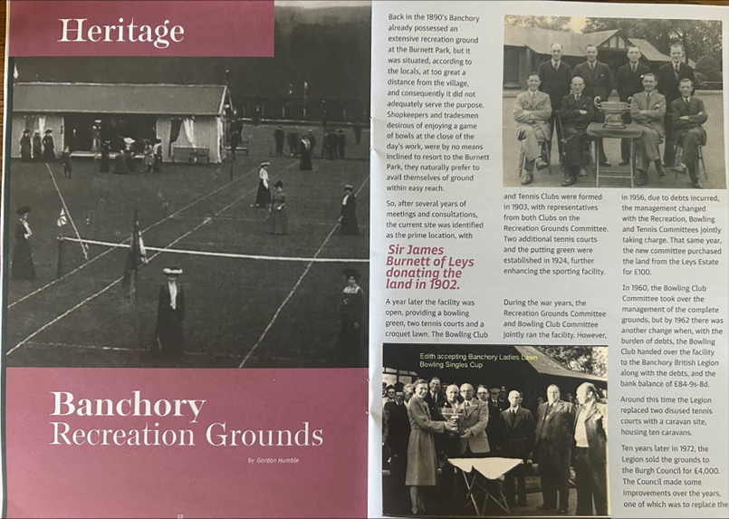 Here are a selection of photos from the past showing the vibrant Recreation Ground in the heart of Banchory. The clubhouse and bowling green are still in use as are a number of tennis courts. The location of the Dee Street MUGA is ideal for visitors and locals as it is situated across from King George V Park and close to the town centre.